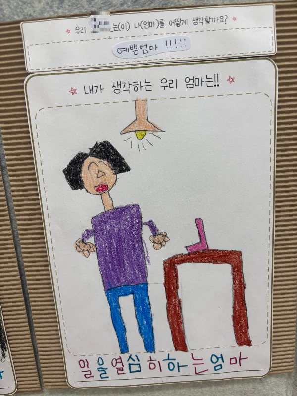대학원에 입학하고 매일같이 노트북 앞에 앉아 있어서 그런지 6살 둘째에게 나는 '일을 열심히 하는 엄마가 되었다'. 그렇지만 아이의 그림에 있는 나는 환하게 웃고 있고, 일을 '열심히'하는 엄마이기에 감사했다.